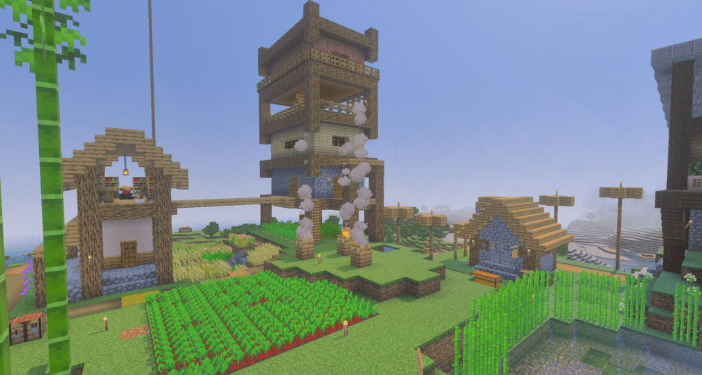 This article is mainly about the updates since I last played, but I’d also like to briefly talk about what else I’ve been working on in the hours upon hours I’ve played of Minecraft in the last week or so. I decided to pick up where I left off on a survival mode file I started about a year ago, and I think I made quite a bit of progress this week. I had taken over a village I found on the side of a mountain (though unfortunately all of the villagers have died at this point) and I built my base right at the top. I’ve built various different farms and buildings around the village so far, including my latest two: a dripstone farm and a cobblestone generator! Sadly, the one thing I cannot figure out is how to build a bee farm, which is what I really need so I can wax all of my copper blocks before they oxidize. For now, though, let’s just pretend the partially oxidized copper (with some blocks more oxidized than others) gives my buildings character or something like that.